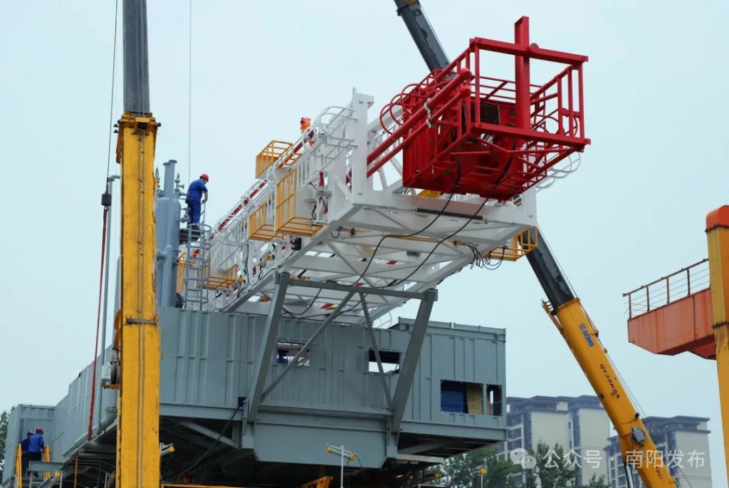 自動化智能180型海洋修井機由南陽二機石油集團公司獨家研製,將於7月底交付山東青島方投入使用。該設備具有自動化程度高、精度高等技術優點。圖為7月10日,技術人員正在組裝自動化智能海洋修井機。