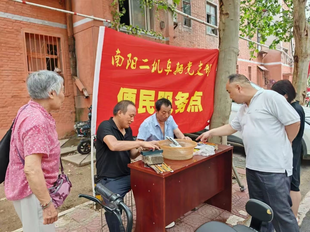 6月28日上午8時,南陽二機集團公司黨委組織的迎"七一"黨員誌願服務大集在油田社區開集。來自公司各基層黨支部的黨員誌願者們,聚焦群眾需求,發揮專業特長,圍繞生活維修、技術服務、政策谘詢等領域,開展磨刀焊補、家電維修、消防知識普及、社保政策解讀等十餘項便民服務,以實際行動踐行"為人民服務"宗旨。