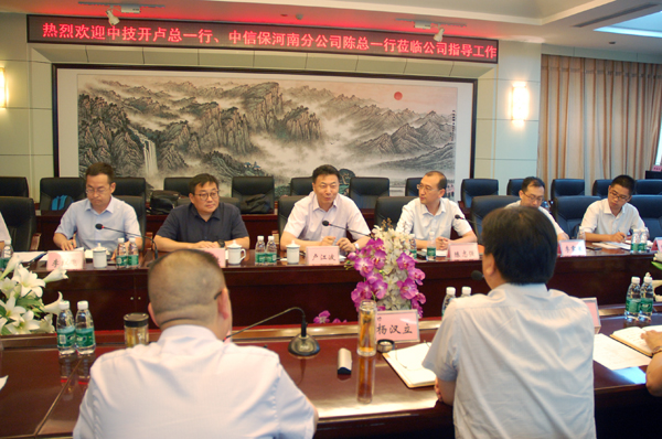 在公司多功能廳,集團公司董事長、黨委書記楊漢立首先致歡迎詞,熱誠歡迎中技開、中信保河南分公司的領導在百忙之中、盛夏季節,不辭辛苦前來公司考察,進一步推進三方合作,共同開發俄羅斯等相關國際市場。