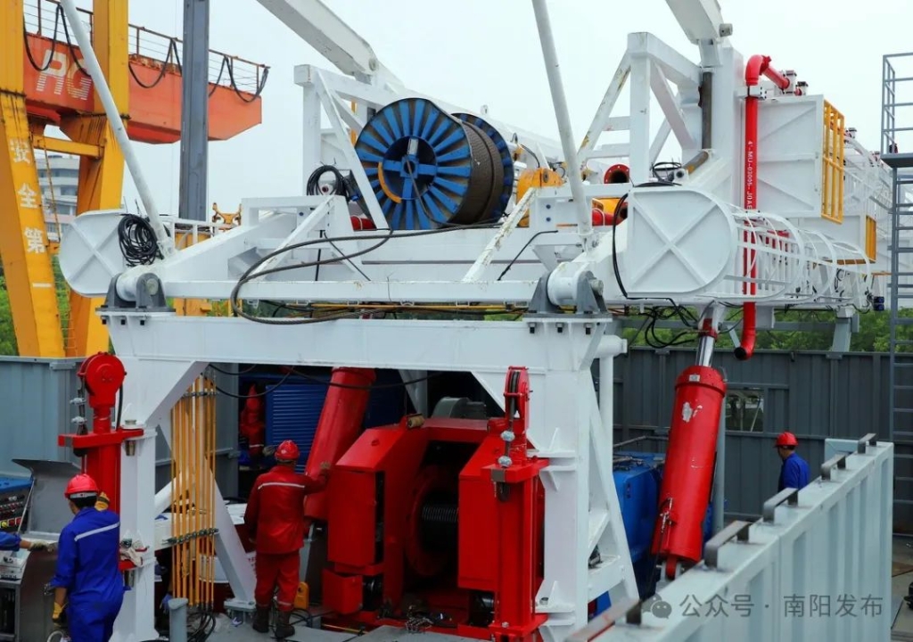 自動化智能180型海洋修井機由南陽二機石油集團公司獨家研製,將於7月底交付山東青島方投入使用。該設備具有自動化程度高、精度高等技術優點。圖為7月10日,技術人員正在組裝自動化智能海洋修井機。