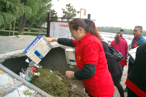 在白河濕地公園,誌願服務隊伍兩人一組沿河從北到南一路認真清理地麵白色垃圾,並將清理的垃圾集中倒入路邊垃圾桶內。